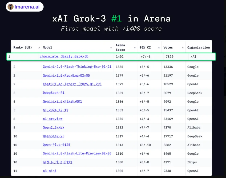 - 竞技场评分:以 1402 分成为首个突破 1400 分的模型,较前代 Grok2 提升近 10%