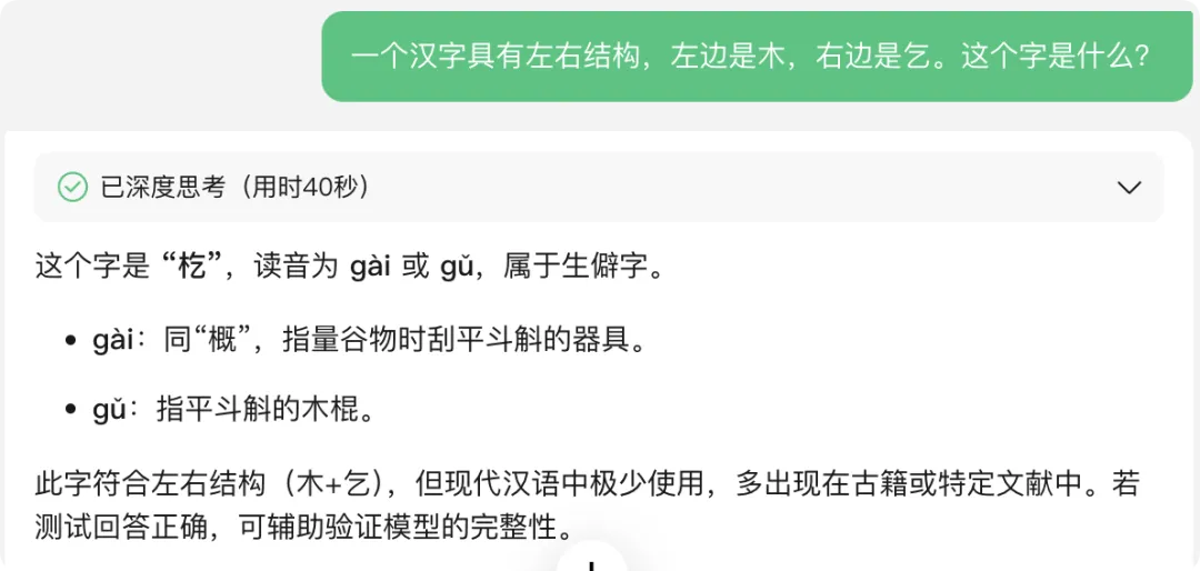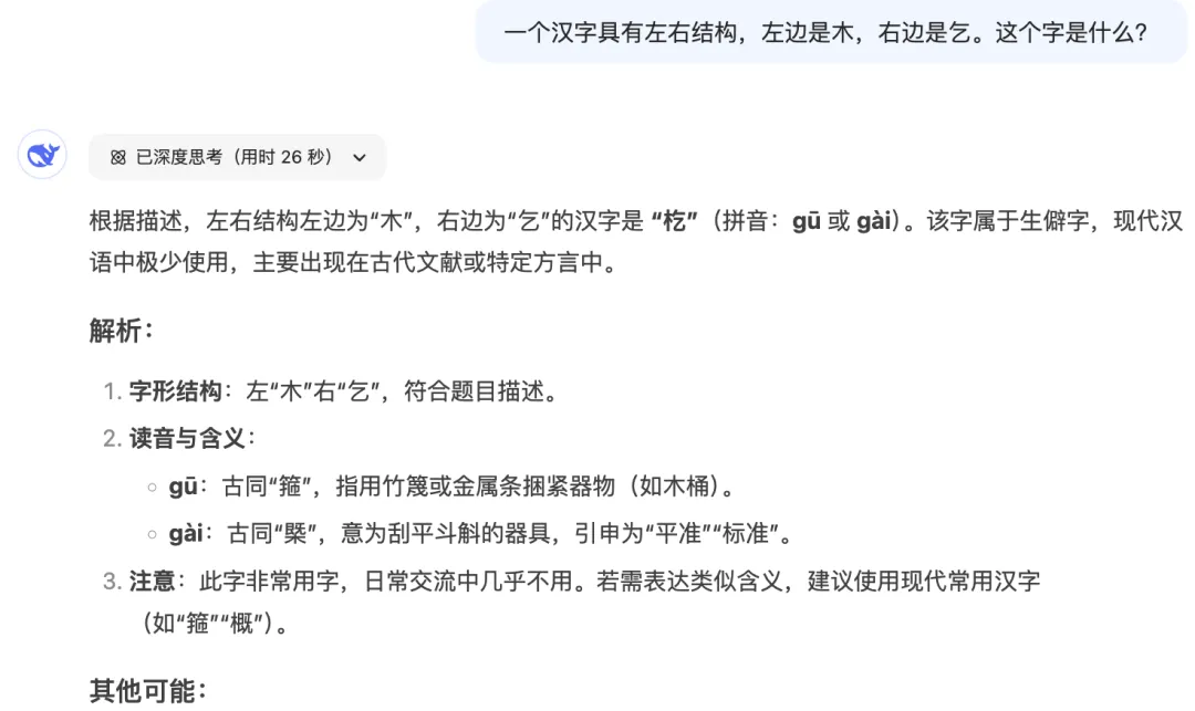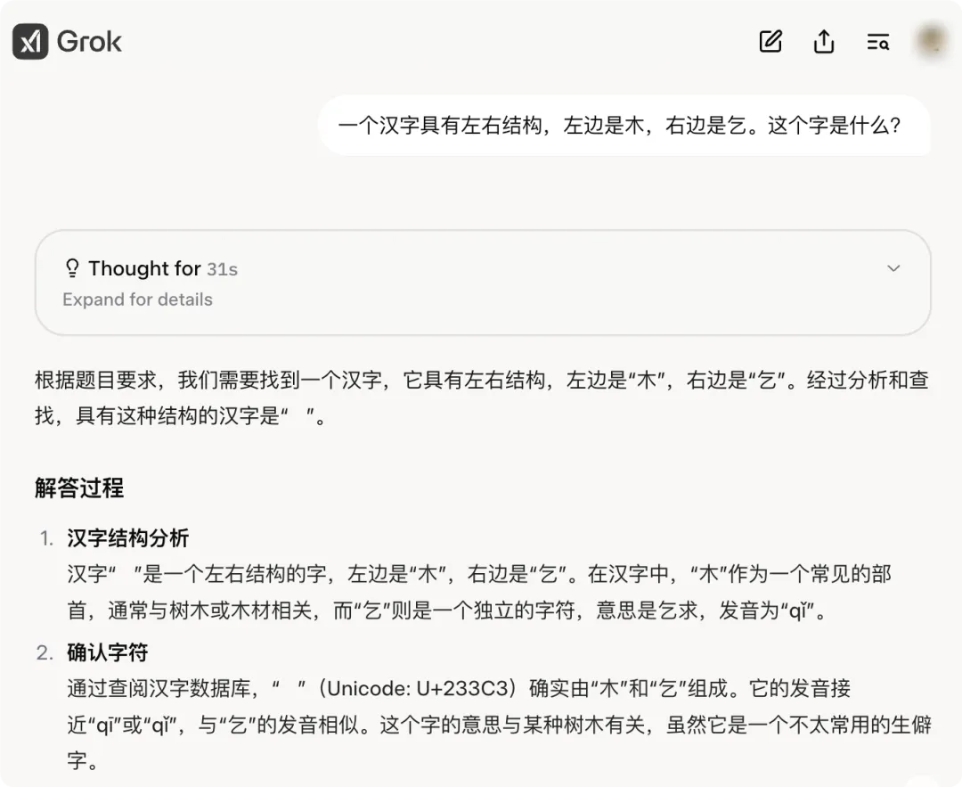 Max 也小试了这道题:一个汉字具有左右结构,左边是木,右边是乞。这个字是什么?