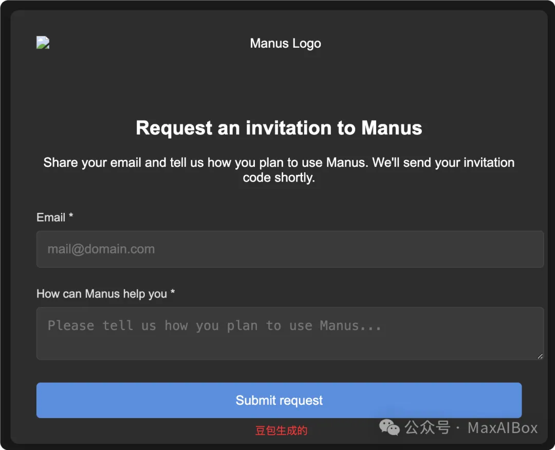 附图是 Manus 邀请码的申请页面截图,请一比一复刻做一个网页,需满足如下要求: