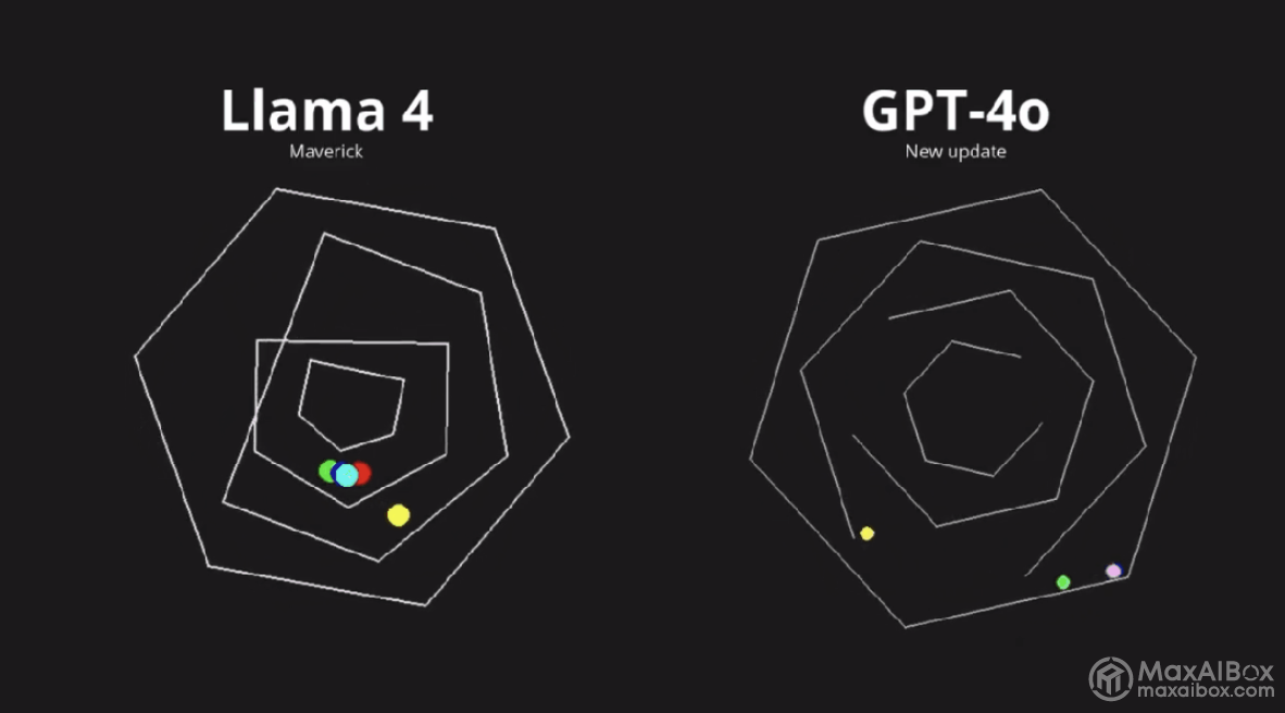 网友Flavio Adamo使用相同的提示词,分别让Llama 4 Maveric和GPT-4o制作一个旋转多边形的动画。