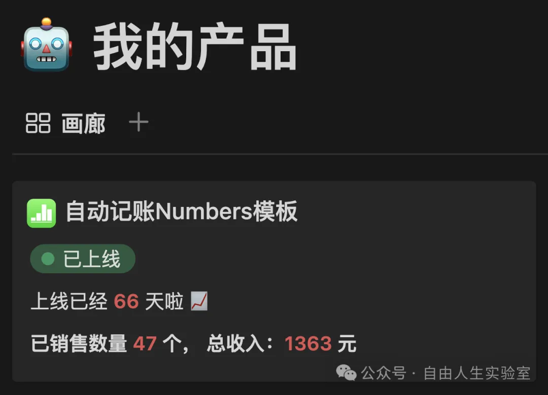 通过上图可以看出,我的这两个系统是相互链接的,比如在我的产品页面有一个自动记账的 Numbers 模板,它通过与财务系统进行互相链接,可以直接看到这款产品的销售数据。