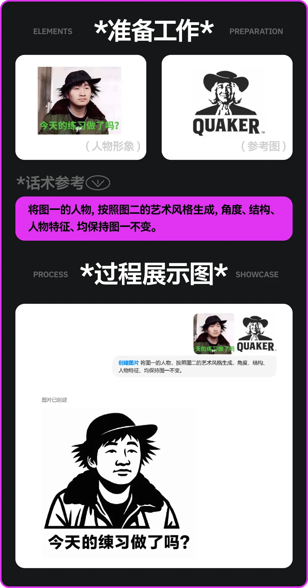 我们再来一个更好玩的,就是表情包的延展!哎~我们画好形象之后,是不是往往会用一些不同的表情和动作来丰富到各种场景上,这一步,现在也不需要你自己画了,我们找到一个表情包的参考,直接让GPT帮我们生成!不过这个话术可能相对复杂一些,大家参考我写的去尝试就可以了。
