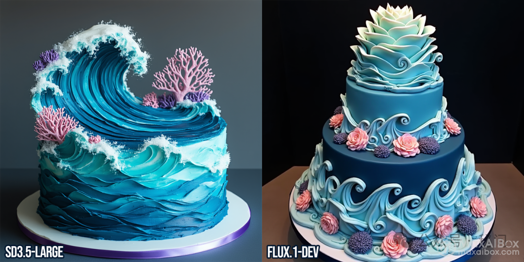 不得不承认SD3.5的aesthetic真是……on another level。虽然它没有完全遵循我提示词里最后说的“pink and purple corals decorating the bottom of ocean wave fondant”(珊瑚不在底边在上面),也没有做出来我说的“forming a curved shape like a blooming rosebud”,但是我真的非常喜欢SD的配色(尤其是这个蓝绿色的渐变,太好看了),以及整体的美学呈现。Flux虽然正确遵循了我的“rosebud”提示词,但也没有get到底边的装饰应该是珊瑚形状的而不是玫瑰,而且它外层的那个浪花看着就很low,离SD3.5的审美差很远。(SD生成的那个蛋糕底座的紫色丝带倒是……有点破坏氛围,但是这种东西也容易P掉)