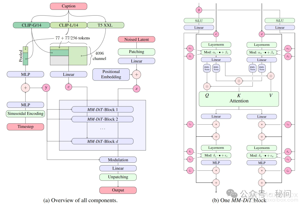 模型结合了三种不同的文本嵌入器——两个CLIP模型和一个T5,以编码文本表示,并使用改进的自动编码模型对图像token进行编码。其核心采用了与Sora相同的DiT技术。