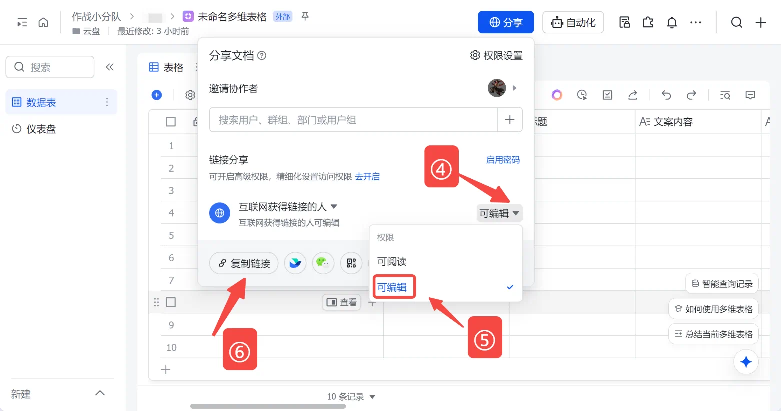 3、获取多维表格链接,直接按我下图显示操作即可。