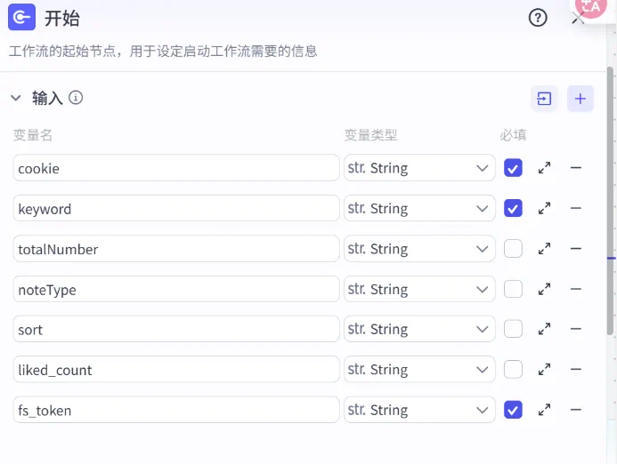 这里输入 cookie,关键字,飞书多维表格链接,当然我们也可以输入:笔记类型、点赞数、提取的笔记数量等,让我们的数据更加精准。