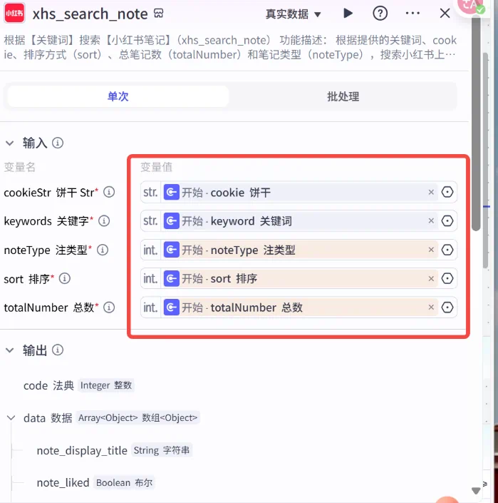 添加步骤:插入插件→搜索“小红书”→找到“xhs_search_note”,点击添加。