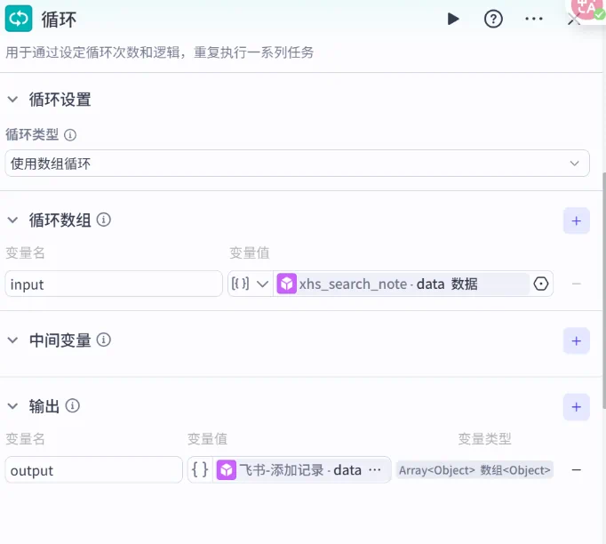 4、结束节点。输出循环节点输出的值即可,因为我们只需要查看飞书多维表格的内容。