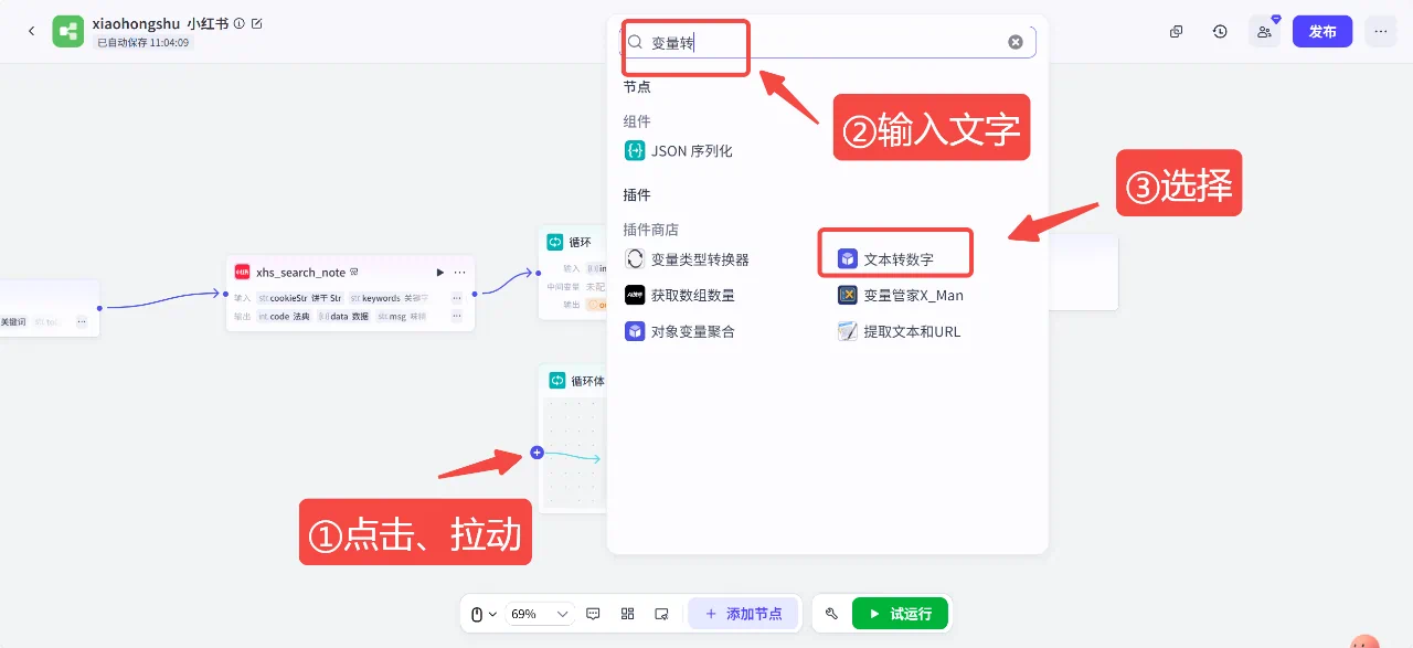 添加步骤:添加节点→搜索“变量转”→点击“文本转数字”插件,即可插入成功。