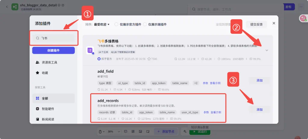添加步骤:添加插件→搜索“飞书多维表格”→找到“add_records”并添加。